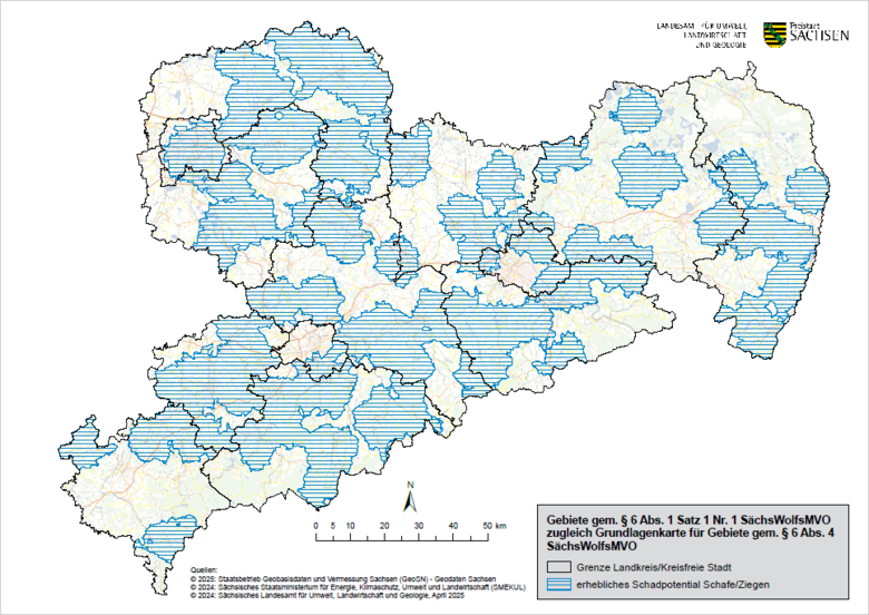 Entsprechend § 6 Absatz 1 der Sächsischen Wolfsmanagementverordnung (SächsWolfMVO) hat das Sächsische Landesamt für Umwelt, Landwirtschaft und Geologie (LfULG) die Gebiete im Freistaat Sachsen zu bestimmen, in denen sich erhebliche betriebswirtschaftliche Werte einer landwirtschaftlichen Schaf- und Ziegenhaltung befinden. Überwindet ein Wolf in diesen Gebieten zweimal die in der SächsWolfMVO empfohlenen Schutzvorrichtungen, ist die Entnahme des schädigenden Wolfes durch die Verordnung zugelassen.